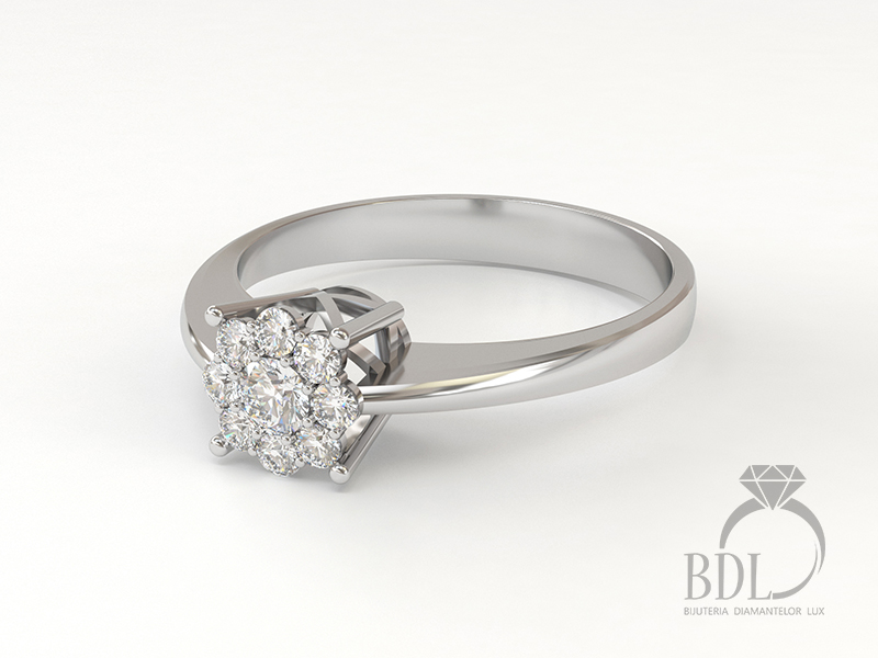 Inel de logodnă tip solitaire Illusion său cocktail realizat din aur alb de 14 kt cu un diamant principal şi 8 diamante secundare tăietură sub formă rotund briliant în setare gheare.